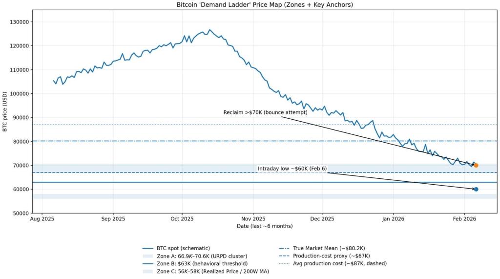 Bitcoin price chart displays demand zones and key technical anchors including the True Market Mean, production-cost proxies, and the recent intraday low near $60,000.